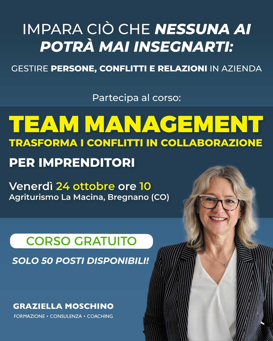 Con i miei Corsi di formazione e la mia Consulenza aziendale da più di 20 anni aiuto gli imprenditori a gestire le risorse umane, migliorare la propria leadership e ottimizzare il tempo e i processi di delega attraverso riunioni aziendali efficaci.